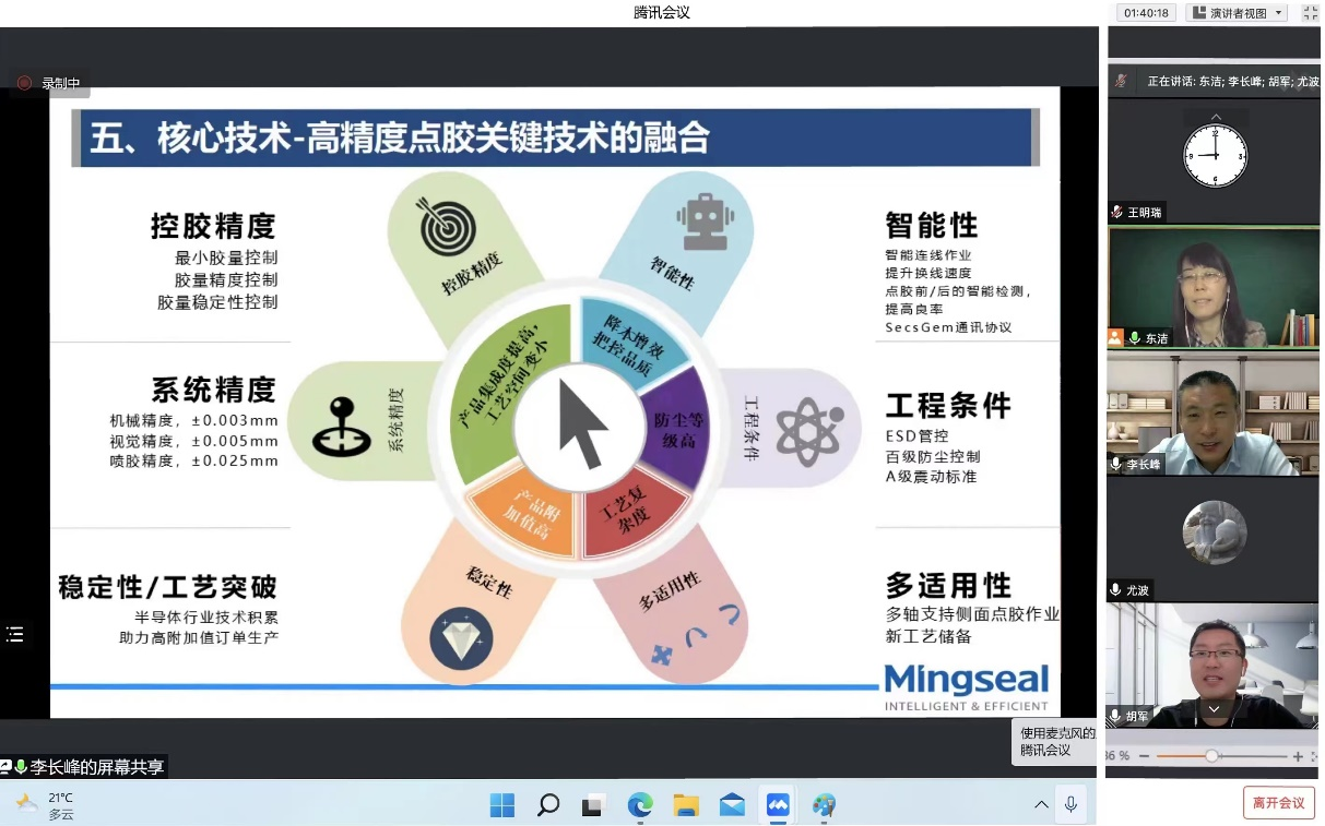 为加强产学研合作,拓展师生学术视野,了解行业前沿,推进控制科学与工程学科建设,应自动化学院邀请,常州铭赛机器人科技股份有限公司研发副总经理、我校兼职硕士生导师李长峰高级工程师,为我院师生作了题为“面向半导体和精密电子行业的点胶、焊接机器人系统解决方案及关键技术”的学术报告。2022年9月2日,主题报告通过腾讯会议线上举行。自动化学院胡军院长、李东洁副院长等学院班子成员、学科骨干教师及来自相关学院的200余名师生在线参会,报告由自动化学院副院长李东洁教授主持。李东洁副院长代表学院对李长峰高级工程师受邀报告,表示衷心的感谢,并鼓励我院师生积极抓住机遇,加强学术交流,瞄准学科前沿,提升科研能力,多产出高水平成果,为学科建设助力。