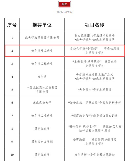 近日,由共青团黑龙江省委员会、黑龙江省青年志愿者协会联合举办的第八届黑龙江省青年志愿服务项目大赛暨2025年志愿服务交流会圆满落幕。经过激烈角逐与严格评审,我院申报的“小蓝鸽——青春铁路线志愿服务项目”从全省314个优秀项目中脱颖而出,荣获大赛铜奖。